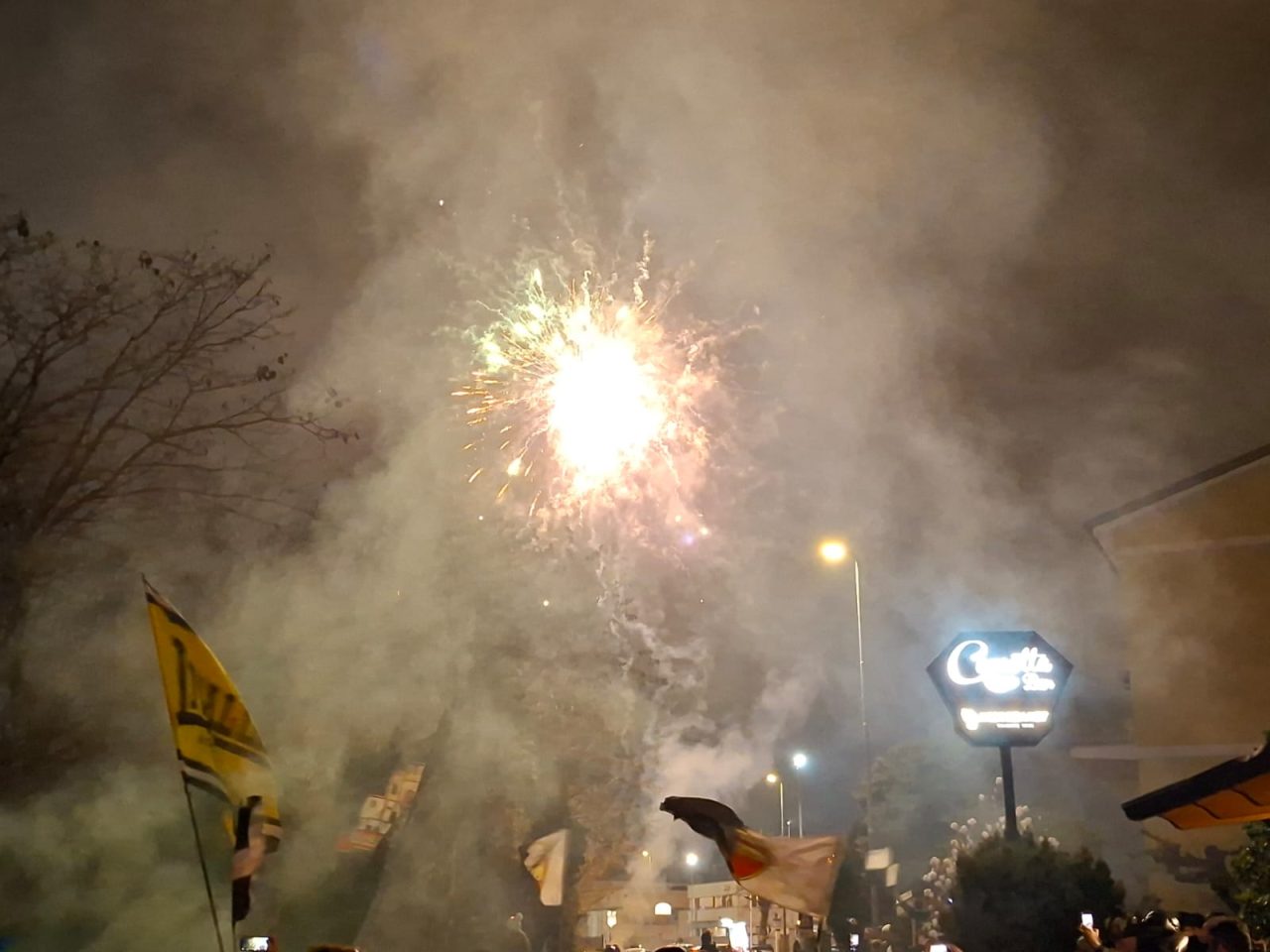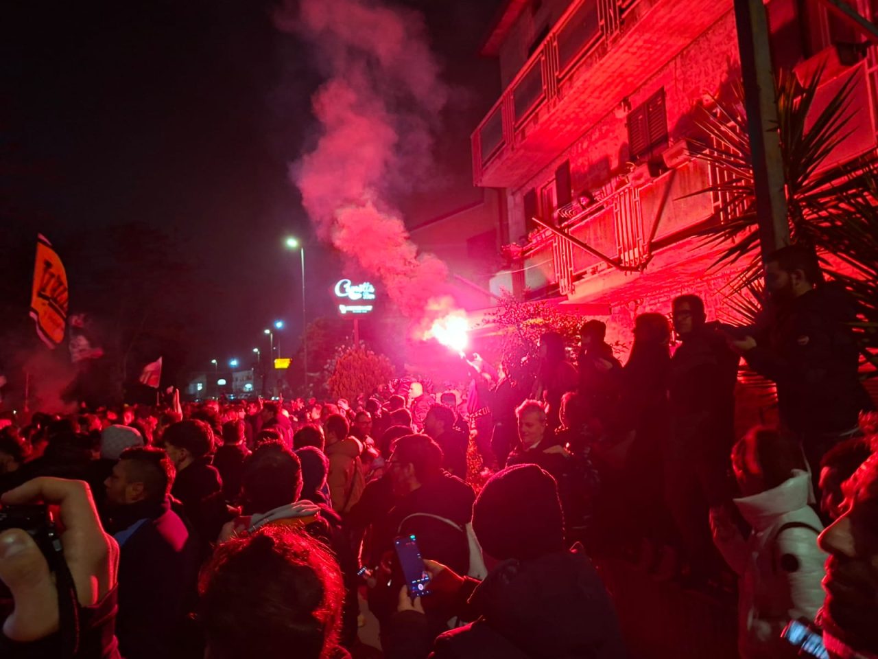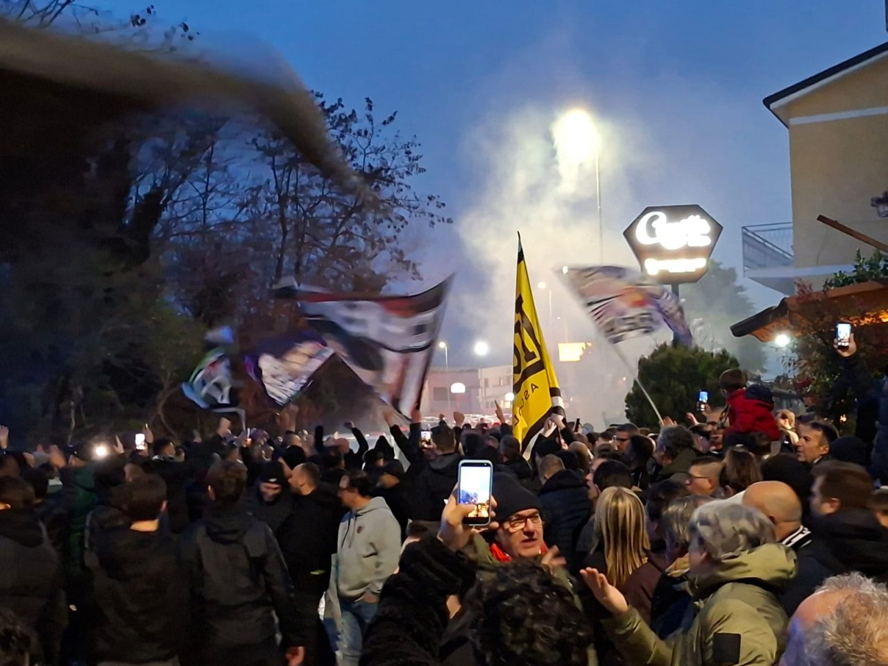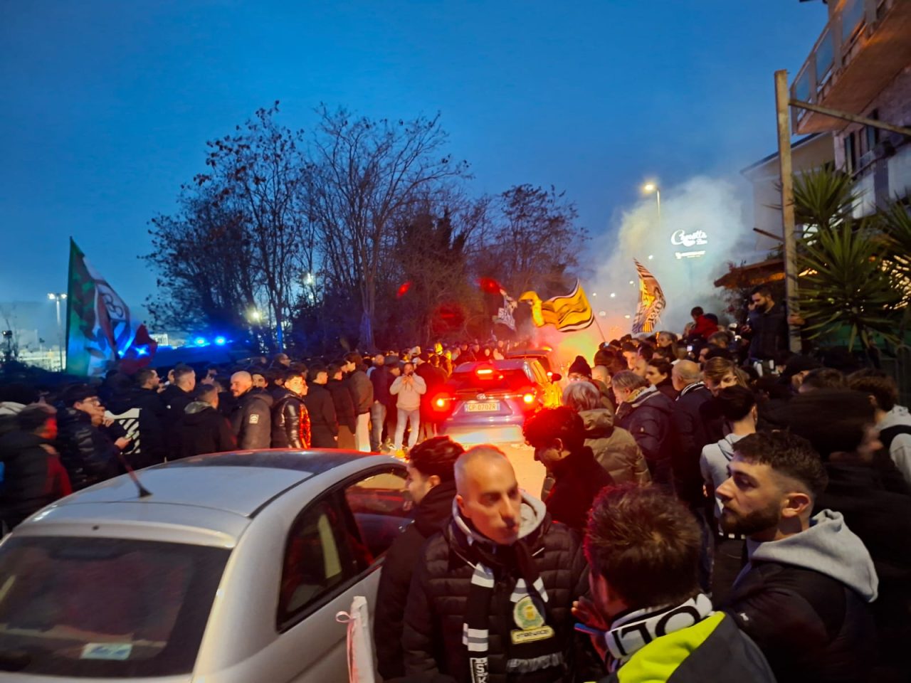 Clima carico per il derby tra Samb e Ascoli. All’esterno del “Picchio Village”, fumogeni accesi, cori a squarciagola e urla di incitamento hanno accompagnato la partenza del pullman dell’Ascoli alla volta di San Benedetto del Tronto.