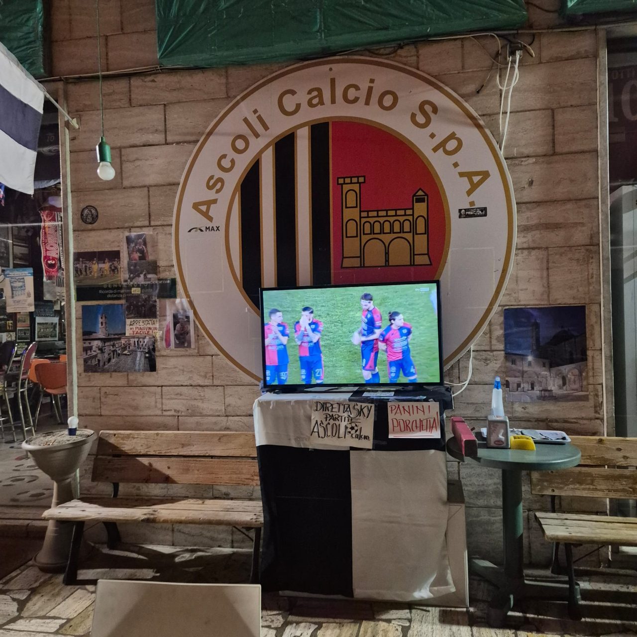 ASCOLI - Vittoria e festeggiamenti intorno al bar Stadio dei tre fratelli Di Cola: santuario bianconero dedicato alla passata grandezza dell’Ascoli. Un tempio della memoria calcistica cittadina