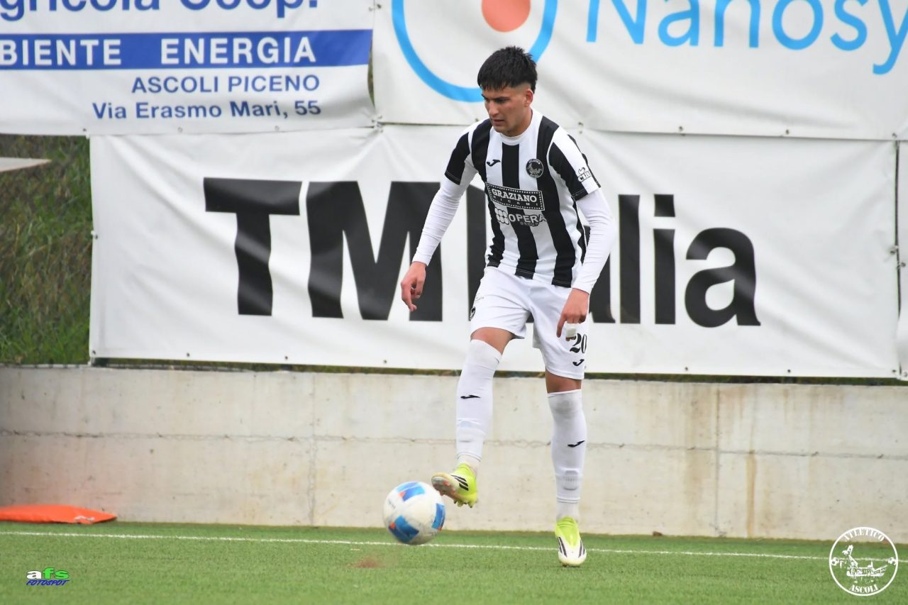 Sfiora subito il gol l’Atletico Ascoli ma i pometini salvano sulla linea. Passano 4’ e arriva il vantaggio dei padroni di casa grazie al colpo di testa vincente di Denis Manu che anticipa tutti e batte Di Giorgio. Un gol che arriva dagli sviluppi di un calcio d’angolo battuto da Binaco.