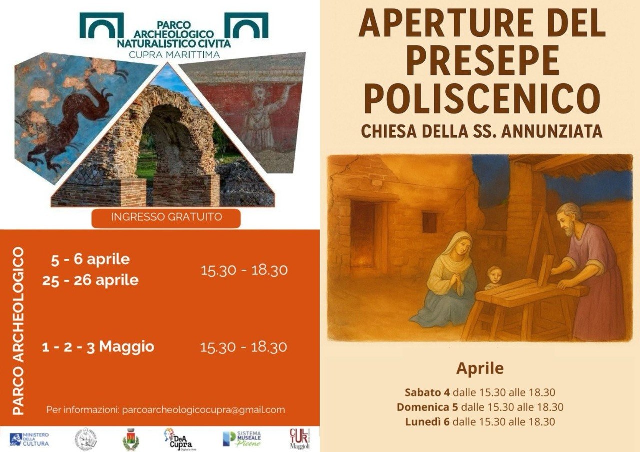 Nel dettaglio, il Parco archeologico sarà aperto il 5 e 6 aprile, dalle 15.30 alle 18.30, con ulteriori aperture già programmate anche per il 25 e 26 aprile e per l’1, 2 e 3 maggio. Due occasioni che consentono di valorizzare il patrimonio culturale e storico della città in un momento in cui Cupra torna ad animarsi dopo la stagione invernale.