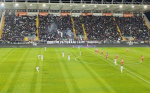 LE PREMESSE – Tomei ritrova Nicoletti al centro della difesa e conferma tutte le attese della difesa. Corradini vince il ballottaggio con Milanese in mediana al fianco di Damiani, Silipo quello con Galuppini sulla fascia destra offensiva. Nella Vis Pesaro l’ex di turno Stellone opta per il consueto 3-4-1-2. Torna il numero 10 Di Paola in mezzo al campo, con gli esperti Pucciarelli e Paganini al suo fianco. Davanti coppia offensiva formata da Nicastro e Lari. Inizia a cantare già dal riscaldamento la curva bianconera.