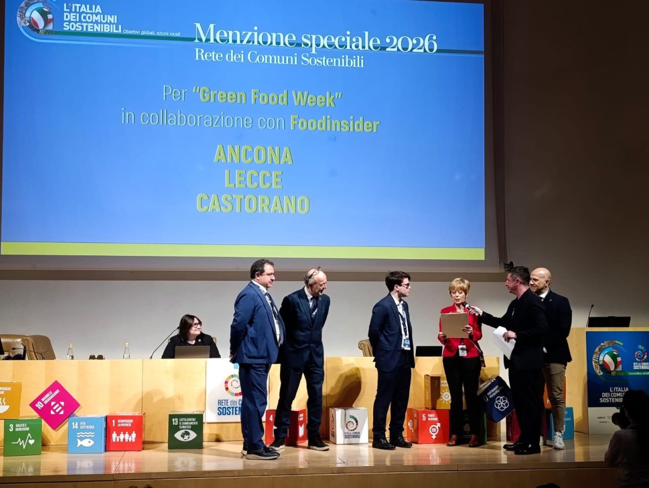 Il Comune di Castorano premiato oggi a Roma, insieme ai Comuni di Ancona e Lecce, con una menzione speciale per il progetto “Green Food Week”, nell’ambito dell’Assemblea 2026 della Rete dei Comuni Sostenibili. Un appuntamento di alto profilo istituzionale dedicato al rafforzamento del ruolo delle autonomie locali nella costruzione di un modello di sviluppo equo, resiliente e sostenibile.
