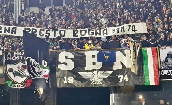 Striscione del gruppo messo in mostra come trofeo dalla tifoseria sambenedettese (si notino i vessilli