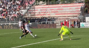 Lonardo scocca il tiro che vale la salvezza della Samb, fotogramma US Sambenedettese