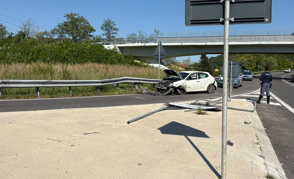 Perde il controllo dell’auto, si schianta contro un camion poi abbatte i pali della segnaletica