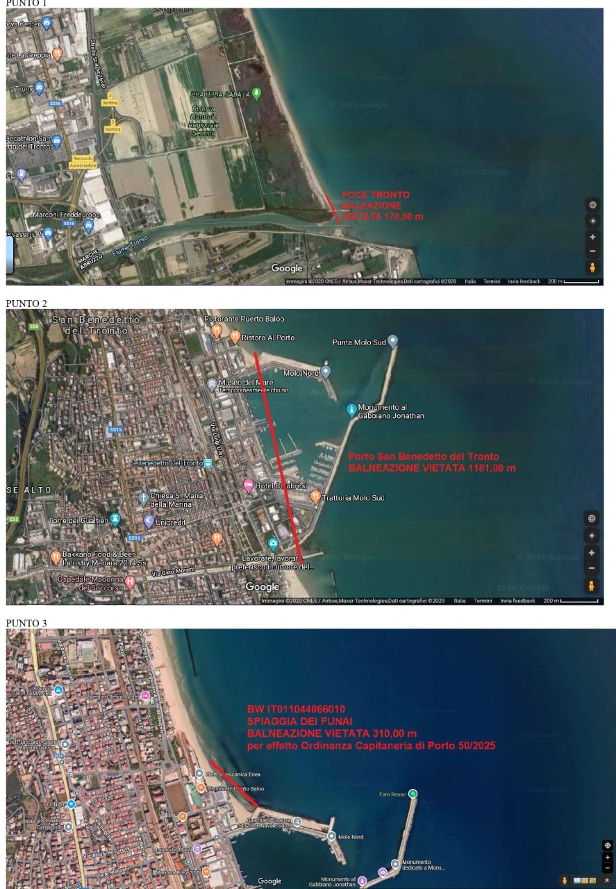 Sono confermate le stesse aree già interdette negli scorsi anni. Rimangono pertanto non adibite alla balneazione le acque del porto per l’intera estensione dell’area portuale, la foce del torrente Albula e il tratto di mare compreso in un raggio di 20 metri dalla testata del cosiddetto “pennello”. Vietato ai bagni, come di consueto, anche il tratto che si sviluppa per 170 metri a sud della foce del Tronto.