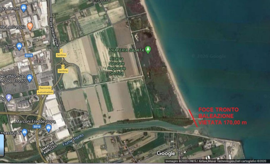 La zona interdetta alla foce del Tronto