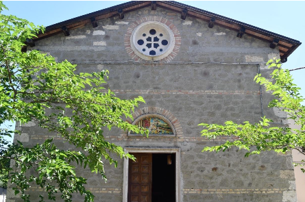 LA CHIESA – La struttura in oggetto presenta una pianta rettangolare con una piccola abside semicircolare. È costruita in pietra locale con tetto ligneo a capanna. A destra della chiesa vi è la torre campanaria, costruita successivamente alla chiesa, mentre sul lato sinistro vi è la sagrestia. La chiesa è intonacata internamente, con un rivestimento in lastre di pietra lungo tutto il perimetro e per una altezza di 1.10m da terra.