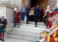 ASCOLI – Il rito funebre nella chiesa di San Pietro Martire. La bara ha varcato la soglia scortata da due capitani di Sant’Emidio. L’inchino del console Crescenzi, il rullio dei tamburi. Ai piedi dell’altare i gonfaloni del Sestiere e della Quintana