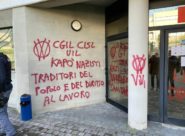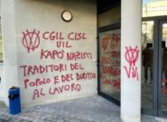 ATTO VANDALICO – Scritte comparse stamattina davanti la Cgil ad Ancona e la Camera del lavoro, i sindacati: «Non ci fermeremo di fronte a queste intimidazioni»